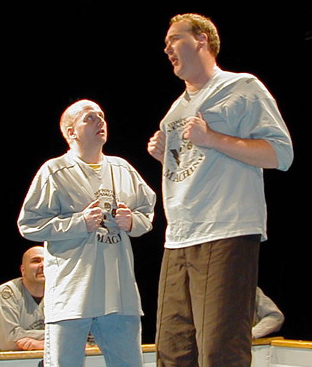 Au deuxième, Hédou était à Moncton, ce qui a benché Joachim pas mal (je n’ai pas remplacé le personnage de Jean-Jacques, je suis beaucoup trop court). Mais encore une fois, je me suis retrouvé spectateur de McSween plutôt que co-équipier ou adversaire. Vous voyez, à 50h, il faut dormir qqtemps, et on avait des shifts pré-déterminés. 8 joueurs par équipe, 2 de chaque côté en rotation en tout temps, 4h de jeu/4h de repos. Moi et McSween étions sur des shifts opposés, donc on ne jouait jamais ensemble (sauf les 2 dernières heures, où tout le monde jouait). Ce qui est drôle, c’est que mon buddy sur le repos avec moi était beau bonhomme populaire avec les filles, et quand on jouait, il n’avait qu’à faire des be-byes dans leur direction pour avoir le vote. Il avait même pas besoin de rentrer! Quand McSween revenait au jeu, il était toute comme, voyons donc, qu’est-ce qui est arrivé au pointage?! Et là, surtout dans le shift de la nuit, il remontait ça pour son équipe, lui aussi avec de l’aide particulière. Il travaillait dans une maison pour jeunes délinquents, pis ces kids-là venaient passer la nuit à l’improvisathon comme seul public, voter pour leur moniteur, tsé! Là nous-autre ont revenait au jeu, pis le score était tout débalancé en faveur de l’autre équipe! Somehow, cet improvisathon a tout de même fini EN SUPPLÉMENTAIRE, avec des pointages dans les 150. McSween avait accumulé le plus de punitions, et ma mémoire me dit que c’était 200quelques. J’ai peut-être exagéré les chiffres avec le temps, mais Stéphane Raymons arbitrait la moitié du temps, donc c’est très possible.