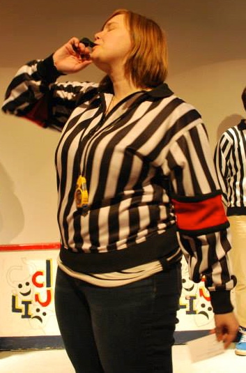 1794519_611500038924464_2721623525569462572_n« Toute personne qui me connait le moindrement est au courant qu’il n’existe pas un tournoi d’improvisation durant lequel je ne suis pas tombée malade. J’étais normalement capable de fonctionner quand même en tant que statisticienne, DJ ou juge. Arrive la Gougoune 2012 à Grand-Sault et voilà que j’arbitre pour la première fois une demi-finale. Quand je me suis levée le dimanche matin, je n’avais pratiquement plus de voix! Dans un état de semi-panique, je commence à chercher quelqu’un qui pourrait me remplacer pour le premier match (ben oui, juste pour faire exprès!). Quand Tornado me croise dans l’école et constate qu’il ne peut pas me comprendre, il se presse à trouver le directeur de l’école pour venir à ma rescousse. Un micro sans-fil et une tisane plus tard, me voilà en train d’arbitrer ce match en faisant un effort inhumain pour ne pas oublier d’arrêter le micro avant de siffler! Juste pour rendre ça encore plus ridicule, je suis en train d’arbitrer en sirotant ma tisane dans une tasse de la PTA pendant que j’arbitre cette même équipe. Faut croire qu’il m’est impossible de faire preuve de bon jugement sous l’effet de médication!!! »