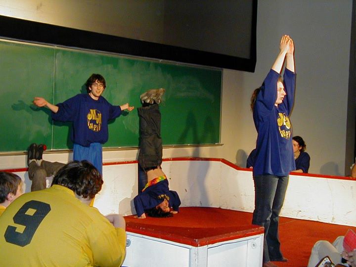 « Première Gougoune à Bathurst – celle où j’ai choisi d’assister à un tournoi d’improvisation plutôt que d’aller à celui de hockey (mon père ne l’a toujours pas compris).   J’ai rencontré Yves Doucet pour la première fois (il était arbitre à l’époque et il était assez raide avec nous, merci!)  Le hasard a ensuite fait qu’il est devenu un mentor en improvisation, en enseignement et dans le « fantasy sport »…).  J’ai également vu l’utilisation la plus débonnaire d’une bouteille d’eau qui puisse être faite dans une improvisation – un heureux mélange de Roy Lajoie de la CDJ, une paire de joggings et une session de magasinage dans la section adulte du magasin de vidéo (avant l’Internet, on se déplaçait à l’extérieur de la maison pour aller chercher des films…those were the days!).  Avec de tels premiers contacts en impro, j’étais parti pour la gloire! »