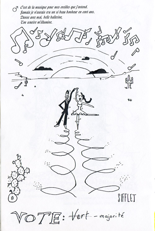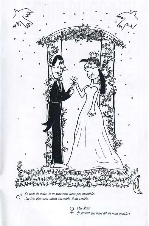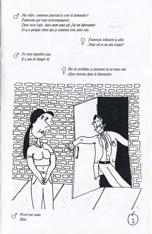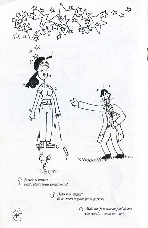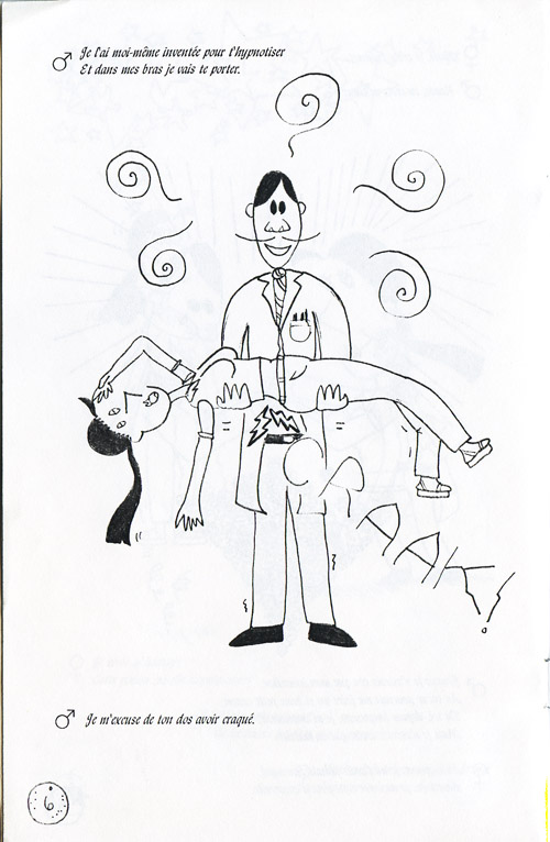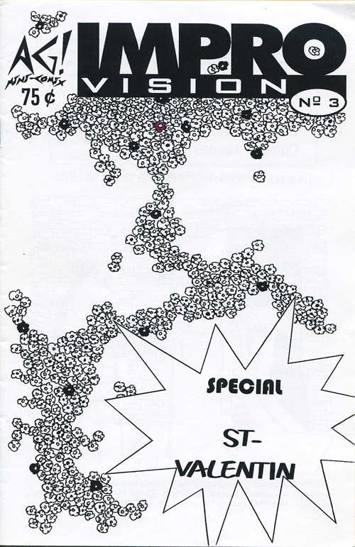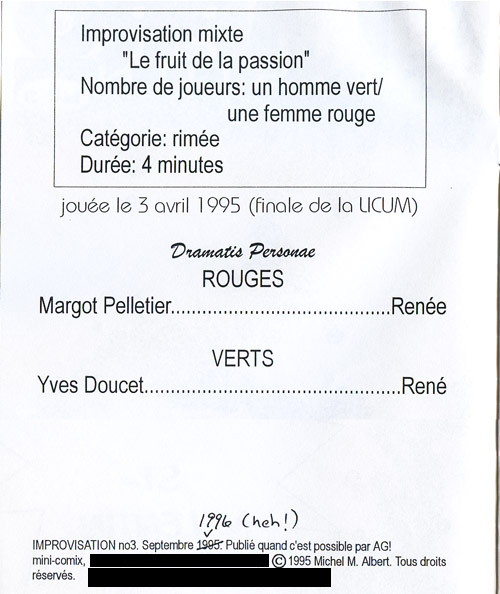Été 1995, travaillant d’une vidéocassette de la récente finale de la Licum, je transcris et adapte en bande dessinée plusieurs de ses improvisations. C’est l’idée derrière Improvision, un mini-comic qui transpose en images les décors, accessoires, costumes, etc. qu’on ne voit pas normalement. Improvisation NB vous a déjà montré le premier et second numéros; voici le dernier de la série, publié en septembre 1996 (ou ’95, ce n’est pas clair ce qui est arrivé là).