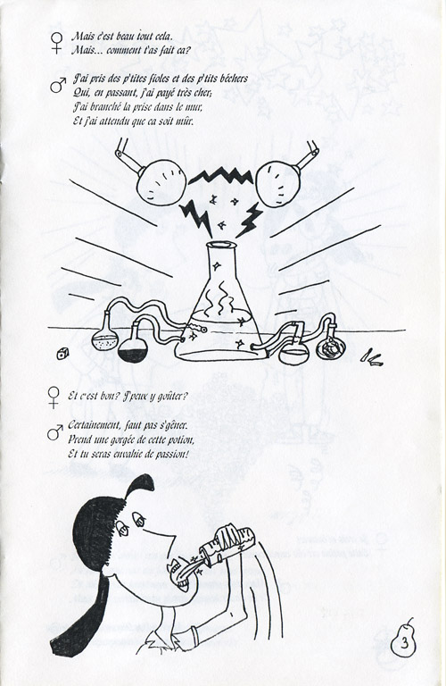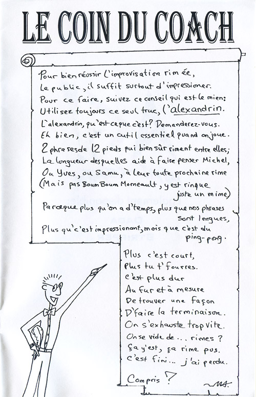 « Le fruit de la passion » est un solide exemple de rimée par un des grands de cette catégorie, Yves Doucet. Sa poésie donne un format particulier à Improvision #3, plus un poème illustré qu’une b.d. Vous retrouverez un « Coin du coach » à la fin et un truc pour réussir la catégorie. Malgré ce que mon avatar dessiné y prétend, je préfère travailler en 8 pieds qu’en 12 pieds, mais bon, c’est un détail. Ma pensée a évidemment évolué dans les derniers 20 ans.