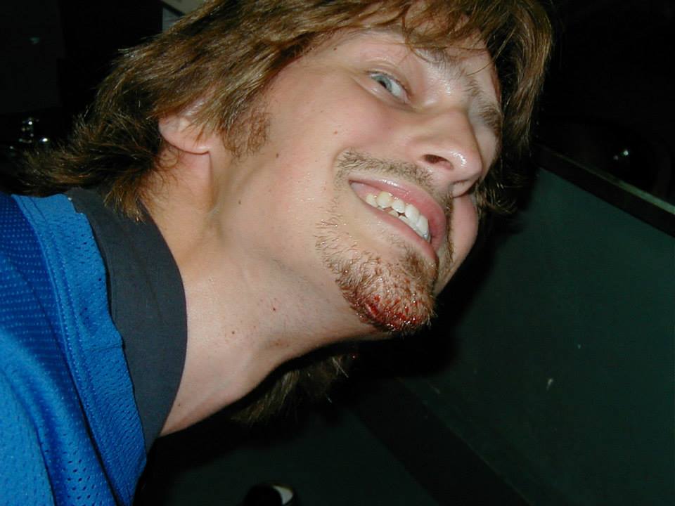 On aurait tendance à croire que Raymond dû se faire coudre le bas du faciès suite à un Royal Rumble ou Impromania, car voilà des événements d’impro qui sonnent violents, mais non, ce n’est que le 3e match de la saison quand Ray-Ray se lance dans une improvisation à saveur d’arts martiaux (son idée, avoue-t-il) avec Nathan Dimitroff. Le voilà qu’il tente un « round house kick » et, s’apercevant qu’il allait frapper Nathan dans le visage, se donne un coup vers l’arrière. Vrai martyr, il sauve Nathan, mais se fait mal lui-même. BAM, dans le plancher menton premier ! Il essaie de continuer, cachant sa honte, mais les autres joueurs sont horrifiés. Le sang coule abondamment. Il doit quitter le match pour aller se faire donner 3-4 points de suture. Faiblesse particulière, car c’était sa deuxième coupure au menton, et il en a eu une autre depuis. Ça fait un bel éclair dans sa barbe aujourd’hui.