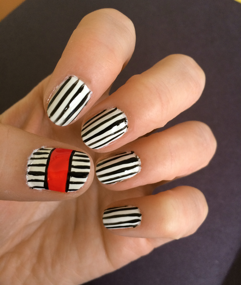 Une fois que la rayure rouge-orange est sèche, ajouter les rayures verticales noires sur les sections blanches de vos ongles. Alignez le plus possible les rayures au-dessus et en-dessous de la ligne rouge-orange.