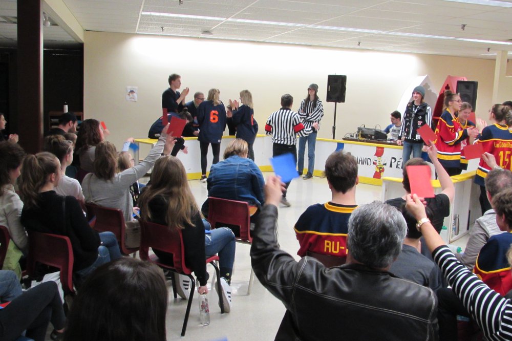 Une façon de simuler le carton de vote coloré et de garder la même tradition vivante, c’est de fournir aux spectateurs, par exemple sur le site web de la ligue ou de l’événement, des images de votes (un bloc rouge et un bloc bleu, disons). Les spectateurs les téléchargent sur leurs téléphones et mettent l’image à l’écran au moment du vote. Les juges de lignes pourront voir des rectangles rouges et bleus dans le noir, ne nécessitant même pas que l’on change l’éclairage dans la salle au moment du vote (ce qui est nécessaire dans certains endroits normalement). Pour les gens qui ont un téléphone, mais pas la capacité d’aller sur le site web, des cartons pourraient être disponibles à l’entrée pour prise de photo, tant qu l’on respecte les normes de distanciation physique et qu’une foule ne soit pas permise de se former autour des cartons (donc à la table d’accueil où il y a déjà une file, le bénévole explique la procédure de vote, donne l’adresse web, ou offre les cartons à prendre en photo collés sur sa table).
