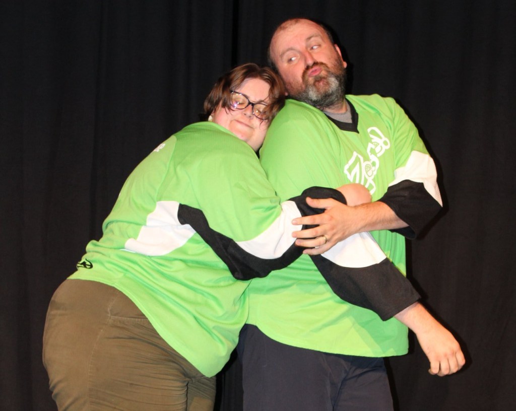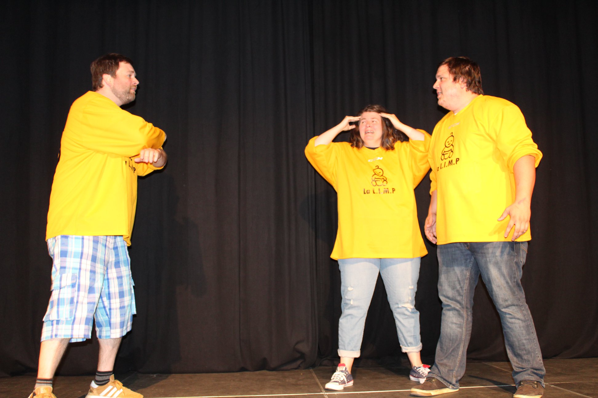 Maintenant, imaginons que ces DEUX personnages sont présents dans l’improvisation de notre travailleur de construction. Il n’agit pas de la même façon avec Jerry qu’avec Maman. Pour le public, c’est la chance de voir deux couleurs d’un même personnage. Pour le joueur qui l’incarne, le défi est de quand même rendre la performance cohérente. Par exemple, si on sait déjà qu’il est frustré avec Jerry, il aura peut-être honte que sa mère se pointe sur le chantier. Si au contraire on a commencé avec la boîte à lunch, peut-être que la rivalité entre lui et Jerry plus tard contient un élément de frustration romantique – ils sont rivaux à cause d’une fille qu’ils veulent impressionner.