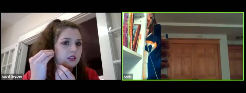 À mesure qu’on explore ce nouveau format en ligne, les joueurs peuvent réfléchir à la place qu’ils occupent devant la caméra et comment celle-ci fournie des informations au public, affecte le déroulement de l’histoire, représente les personnages, et crée des effets ou tons. Quelles sont les impacts de se positionner au centre du plan versus laisser des espaces vides en se plaçant à droite, à gauche, en haut ou en bas de celui-ci? En se tenant loin de la caméra, un joueur peut opter pour une mise en scène qui utilise davantage le jeu physique et le corps puisqu’il apparaît plus à l’écran. En se rapprochant le visage très près de la caméra, il peut montrer des expressions faciales subtiles, permettant au public de s’investir dans l’émotion du personnage. Ou il peut créer une profondeur en ayant à la fois quelque chose près et quelque chose loin de l’objectif de la caméra, que ce soit une main étirée vers celui-ci ou de différents objets pendant une catégorie marionnette.