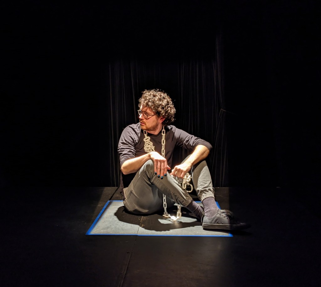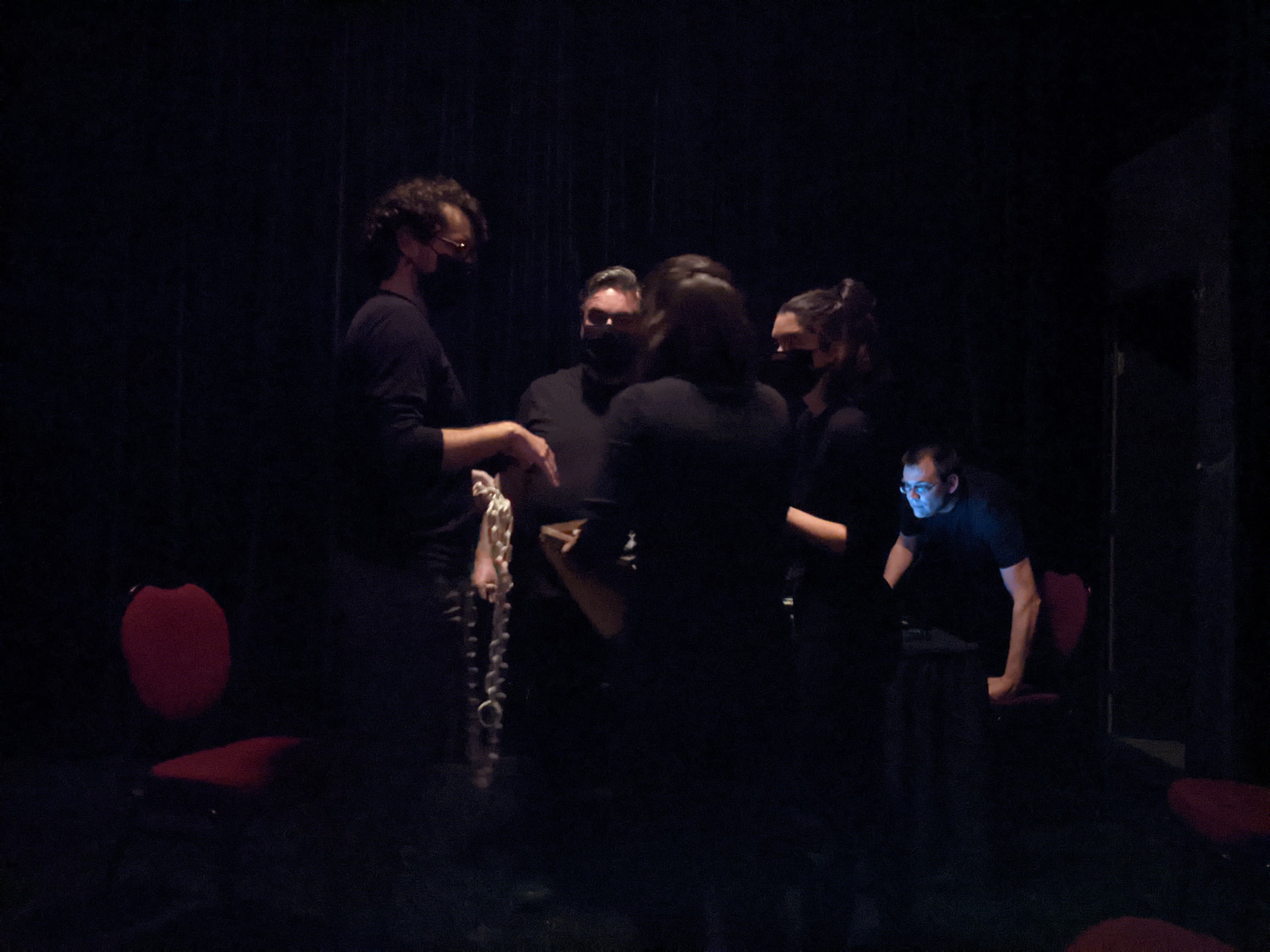 C’est toujours intéressant de recevoir un commentaire qui laisse croire que c’était plus contrôlé que ce ne l’était vraiment. Dans ce cas, quelqu’un m’a par après demandé si les annonces de la voix de la prison étaient pré enregistrées ou si le texte-à-voix était fait sur place, selon les besoins de la pièce, parce qu’ils marchaient trop bien avec l’action. Tous les messages étaient préenregistrés (pour leur donner des effets de production) et juste assez vagues pour servir. Il y avait aussi des versions différentes de chaque message impliquant un différent comédien, donc je pouvais m’adapter. Il faut être bien préparé, mais le crédit va entièrement aux comédiens qui ont su intégrer les messages dans leur improvisation, acceptant le « robot » comme 5e personnage.
