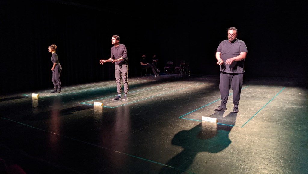 Une des choses que l’on remarque au premier acte, c’est que la mise en scène a un impact sur le comédien autant que sur les attentes du public. Il semble inévitable que les deux corridors au centre de la scène (Bass et Ludger) formeraient la base de l’histoire, alors que les deux extrémités (Annik et Bianca) seraient reléguées au soutien. (Enfin, c’est peut-être aussi parce que Bass et Ludger étaient les premiers à s’avancer sur scène.) Alors que le pivot s’en venait, les comédiens se sont donné leur propre twist : J-Charles, pour qui tout va maintenant mal, tue Stéphane. Comment Bass allait-il se sortir de ce pétrin pour ne pas passer le deuxième acte couché par terre?