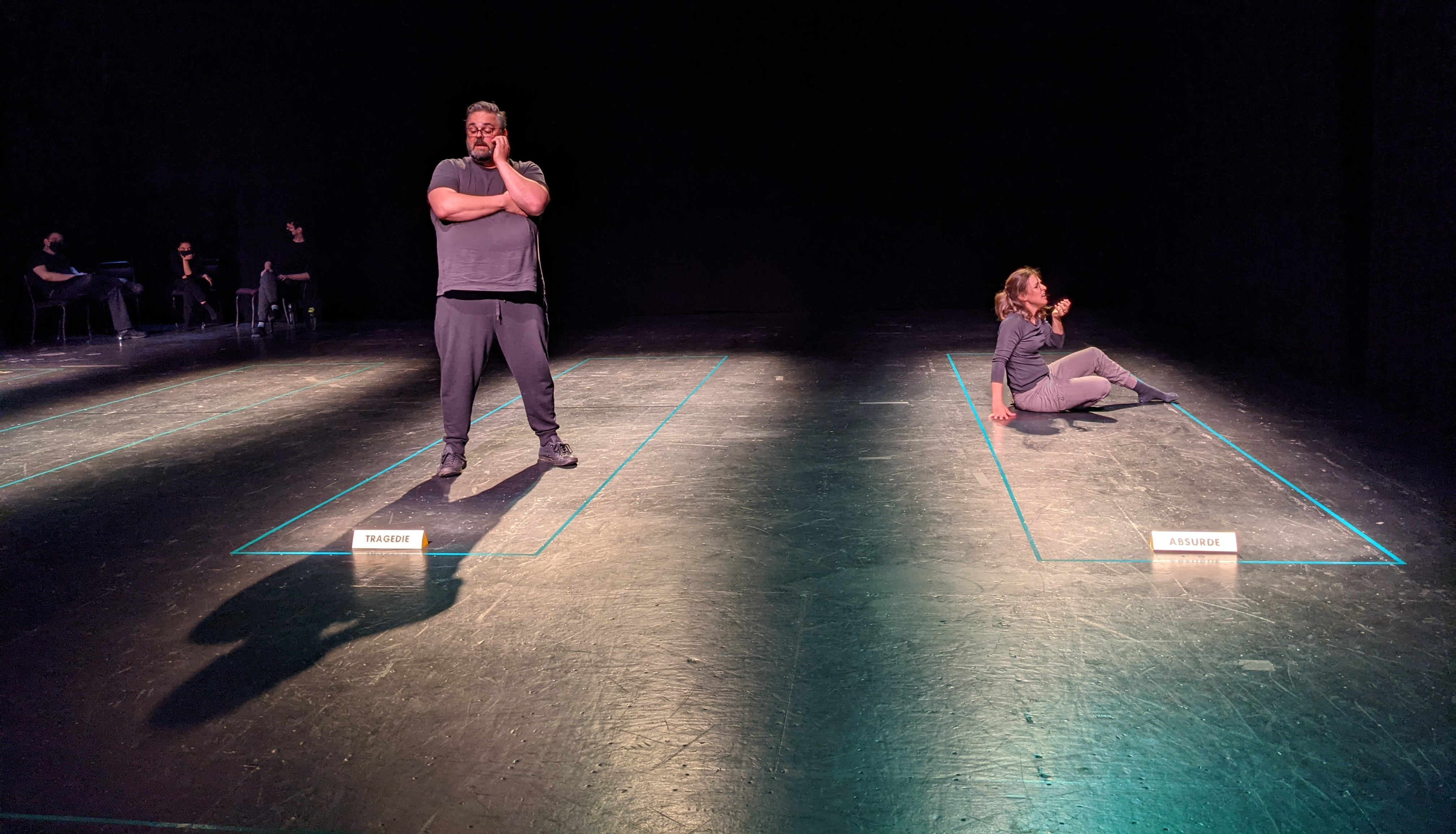 Ce qu’on réalise au deuxième acte, c’est la force de l’Absurde. Même si un seul personnage y est techniquement associé, il se répand aux autres corridors. Stéphane peut revenir de la mort. Marie-Pierre peut ne pas voir ce qui est péniblement évident. Marcelle peut se souvenir de son premier acte hallucinant. C’est en fait une réaction au médium de l’improvisation lui-même. La proposition (jouer une pièce sans décors, costumes, ou texte) est absurde, et on ne peut pas véritablement s’en échapper.