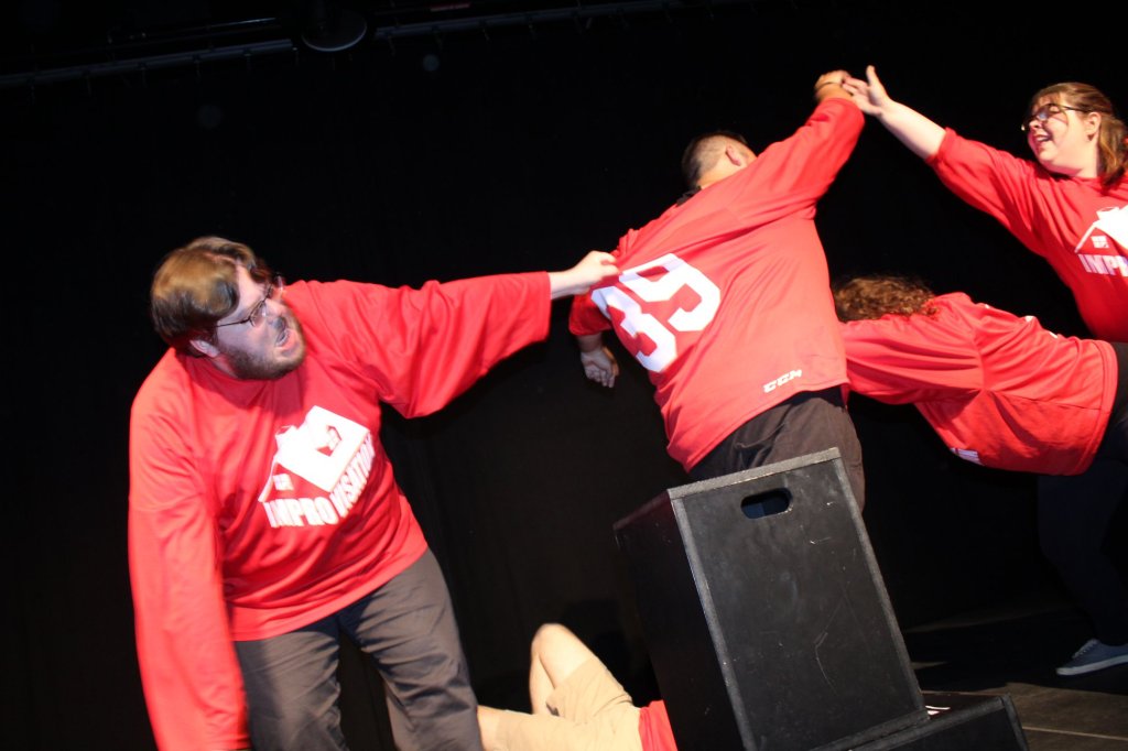 C’est un outil qui nous vient du théâtre traditionnel pour être ensuite adopté par les ateliers de construction d’équipe (team-building). L’idée est de représenter l’idée que travailler avec une équipe implique une confiance implicite en ses coéquipiers. Je m’assure que tu ne tombes pas, et c’est aussi vrai sur la glace. Si t’as de la difficulté dans une impro, je suis là pour t’aider. Si tu te casses la gueule, je suis là pour t’encourager. Tu as confiance en moi de ne pas te juger, de ne pas te disputer, de ne pas t’abandonner, de ne pas dérailler ton idée.