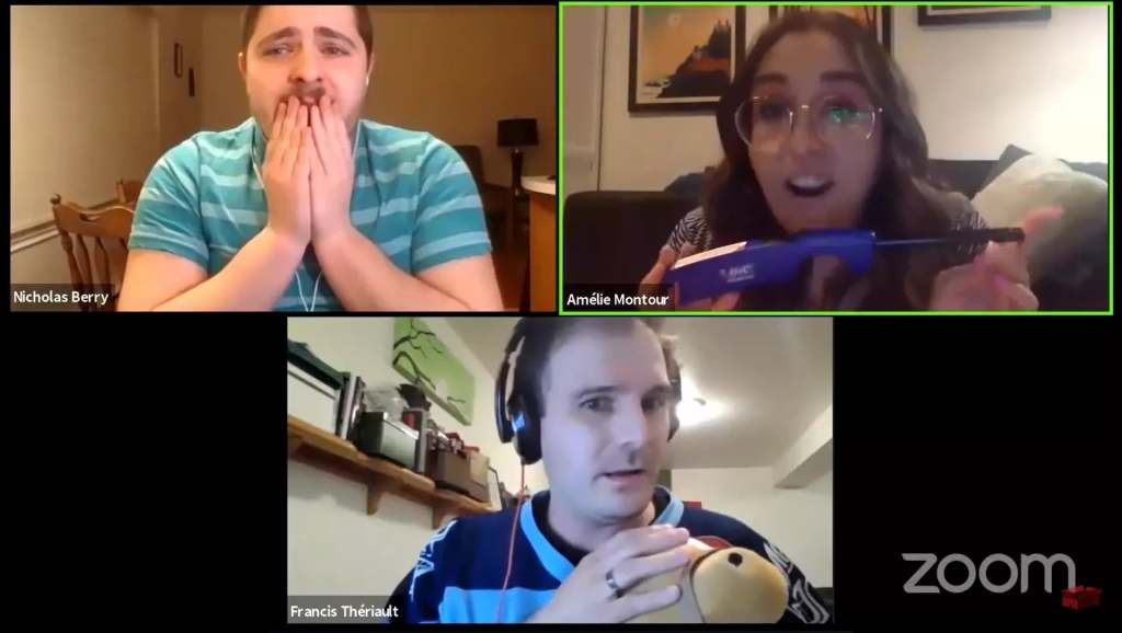 Lorsque l’arbitre lit le thème, je pense évidemment à une situation, mais plus souvent je songe d’abords à des personnages. Je sélectionne rapidement plusieurs morceaux dans ma tête. J’assemble les morceaux tout en participant au caucus. Les idées de mes collègues m’aident à mieux voir l’image dans ma tête. Par exemple, si le thème est « Silence sur la rivière Castor », je pense à un personnage en canot. Premier morceau. Elle aime la nature et s’y connaît. Deuxième morceau. Elle me fait penser un peu à une guide touristique trop enthousiaste, troisième morceau. Je vois son chapeau dans ma tête, son gilet de sauvetage, sa pagaie, la couleur de son canot, etc. Dans le caucus, un collègue suggère un autre personnage dans le canot et l’image commence de plus en plus à prendre forme. Sont-ils amis? L’autre personnage est-il aussi à l’aise en canot? Se cachent-ils quelque chose? C’est important pour moi d’imaginer tous ces petits détails, car je dois voir le personnage clairement dans ma tête pour ensuite l’incarner.