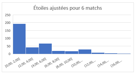 On voit alors que la moitié des joueurs ont moins de 2 étoiles après une pleine saison. D’ailleurs, 37,5% des joueurs ont fini leur année sans aucune étoile. Ne vous sentez pas mal si c’est votre cas; vous êtes dans la majorité! Les trois quarts des joueurs vont avoir moins de 6 étoiles par saison et ce n’est que le top 10% des joueurs qui peuvent récolter plus de 10 étoiles. C’est un impressionnant 1,75 étoiles par match!