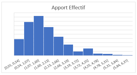 L’apport effectif est la quantité d’apport gagné par match. Encore une fois, on voit que la majorité des joueurs se retrouvent ensemble dans les valeurs basses. Trois quarts d’entre eux ont moins de 2,4. Ce ne sont que les joueurs exceptionnels, le top 10%, qui réussissent à sauter drastiquement dans des valeurs surpassant le 3,0.