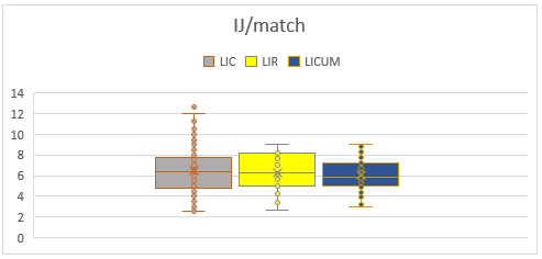 Dans ce graphique, chaque ligne horizontale représente un quartile. Les points extrêmes de la LIC sont probablement dû à des erreurs de prises de stats car le point le plus haut représente une moyenne de 12,66 impros jouées par match ce qui voudrait dire que le joueur en question aurait joué toutes les impros de la saison ET des supplémentaires. Il semble plus probable que le statisticien a oublié de lui monter son nombre de matchs à un moment donné.