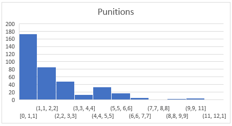 La plupart des joueurs (40%) finissent leur saison sans aucune punition personnelle. Remarquons cependant qu’à l’autre extrême, environ 1% des joueurs récolteront au-delà de 10 punitions par eux-même! Ils sont dans une toute autre catégorie.