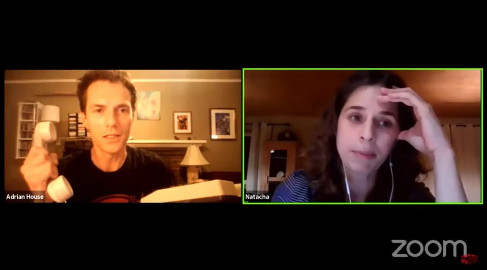 Quand vient l’heure d’aller en live, tout le monde éteint sa caméra et je partage mon écran ainsi que mon son afin de diffuser la vidéo de décompte (si vous ré-écoutez les matchs sur YouTube, vous pouvez parfois me voir me précipiter d’une fenêtre à l’autre au début). Zoom partage n’importe qu’est-ce qui sort de mes écouteurs donc je dois également m’assurer que la fenêtre de diffusion est tamisée pour éviter l’expérience très désagréable d’entendre le match deux fois, avec un délai de 20 secondes. Il est aussi important d’éteindre n’importe quoi d’autre qui viendrait interrompre l’expérience d’un auditeur – personne ne veut entendre mes notifications de Discord pendant un match d’impro. Je regarde habituellement le début du match sur mon téléphone pour m’assurer que tout est en ordre et qu’il n’y a pas de troubleshooting additionnel à faire.