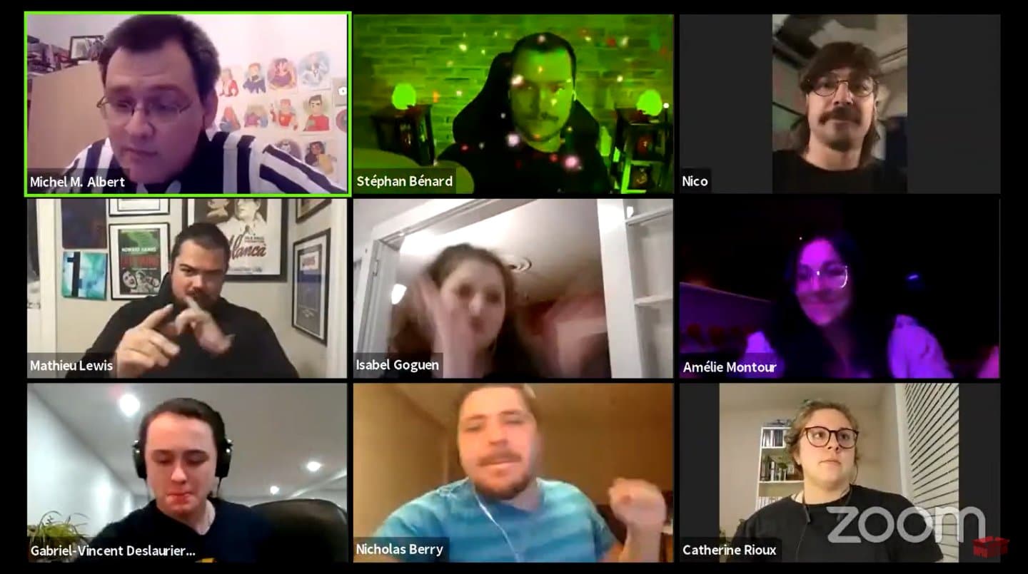 Les équipes se joignent à nous un peu plus tard (quoi qu’il arrive souvent qu’un joueur se présente très tôt sans le reste de son équipe, l’équivalent en ligne d’interrompre une réunion à laquelle tu n’es pas sensé participer; c’est amusant pour nous, mais j’imagine que c’est awkward pour eux) et je m’assure que leurs paramètres Zoom sont optimisés pour le jeu en ligne. Pendant la première saison de La Click, ce processus paraissait intimidant et prenait plus de temps puisqu’on n’était pas encore habitué aux nuances entre les systèmes auxquels les gens peuvent avoir accès. Sur mobile ou bien à partir d’un navigateur web, Zoom ne fonctionne pas de la même façon, les menus sont formulés différemment et certaines options n’apparaissent pas de façon évidente (pour voir plusieurs personnes à la fois sur mobile, il faut swiper l’écran… Ça m’a pris quelques matchs avant de trouver l’option). Maintenant, nous sommes tous des pros et cette portion de l’avant-match se fait très rapidement.