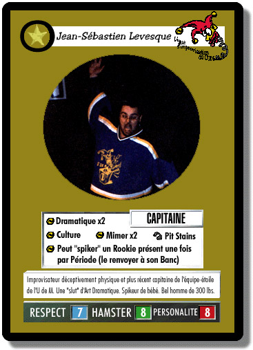 Concept : Toutes les cartes de joueurs ont le même design à la base. Dans le rectangle au-dessus de ses habiletés, on voit qu’il était CAPITAINE de cette équipe. Chaque habileté d’improvisateur est représentée par un grelot (tiré du chapeau du clown de la Licum) et parfois d’un spring suivi du nom d’une carte que vous placez dans votre paquet et que Bass (dans ce cas-ci) peut aller fouiller et chercher quand il en a besoin, sans attendre qu’elle se trouve dans votre main. Donc, Bass est très fort en Mimée (x2), à jouer des impros seul (Solo), et en Dramatique. De plus, à la fin du match, si quelqu’un joue une carte de Prix – Joueur le Plus Étoilé – Bass la gagne automatiquement pour des points bonis. (À noter que cette carte ne sortirait que l’année suivante, question de faire des promesses que le jeu continuerait.) Enfin, son « spring » va lui chercher Toutes mes Fans, une carte qui donne plus de Personalité à Bass et le rend invulnérable aux Punitions et autres Difficultés (basé sur le fait qu’il avait non seulement des admirateurs, mais sa gang et sa famille souvent aux matchs pour l’appuyer).