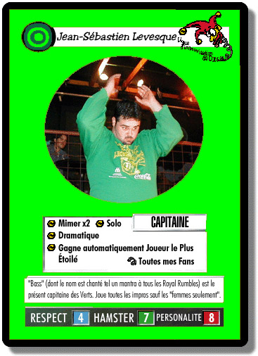 Concept : Toutes les cartes de joueurs ont le même design à la base. Dans le rectangle au-dessus de ses habiletés, on voit qu’il était CAPITAINE de cette équipe. Chaque habileté d’improvisateur est représentée par un grelot (tiré du chapeau du clown de la Licum) et parfois d’un spring suivi du nom d’une carte que vous placez dans votre paquet et que Bass (dans ce cas-ci) peut aller fouiller et chercher quand il en a besoin, sans attendre qu’elle se trouve dans votre main. Donc, Bass est très fort en Mimée (x2), à jouer des impros seul (Solo), et en Dramatique. De plus, à la fin du match, si quelqu’un joue une carte de Prix – Joueur le Plus Étoilé – Bass la gagne automatiquement pour des points bonis. (À noter que cette carte ne sortirait que l’année suivante, question de faire des promesses que le jeu continuerait.) Enfin, son « spring » va lui chercher Toutes mes Fans, une carte qui donne plus de Personalité à Bass et le rend invulnérable aux Punitions et autres Difficultés (basé sur le fait qu’il avait non seulement des admirateurs, mais sa gang et sa famille souvent aux matchs pour l’appuyer).