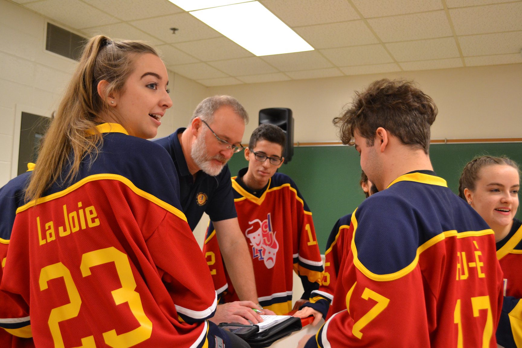 Les équipes s’entremêlent, s’encouragent et reviennent ensuite à leur banc. Vous vous joignez à vos coéquipiers qui se mettent en position pour le caucus. Votre entraîneur est à l’extérieur de l’arène avec un joueur de chaque côté, deux scellés sur la bande et deux dans l’arène prêts à embarquer. Ce qui crée un genre de cercle pour le caucus.