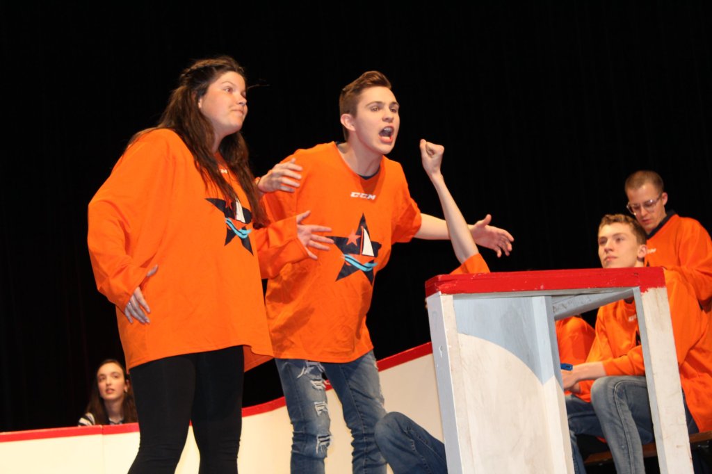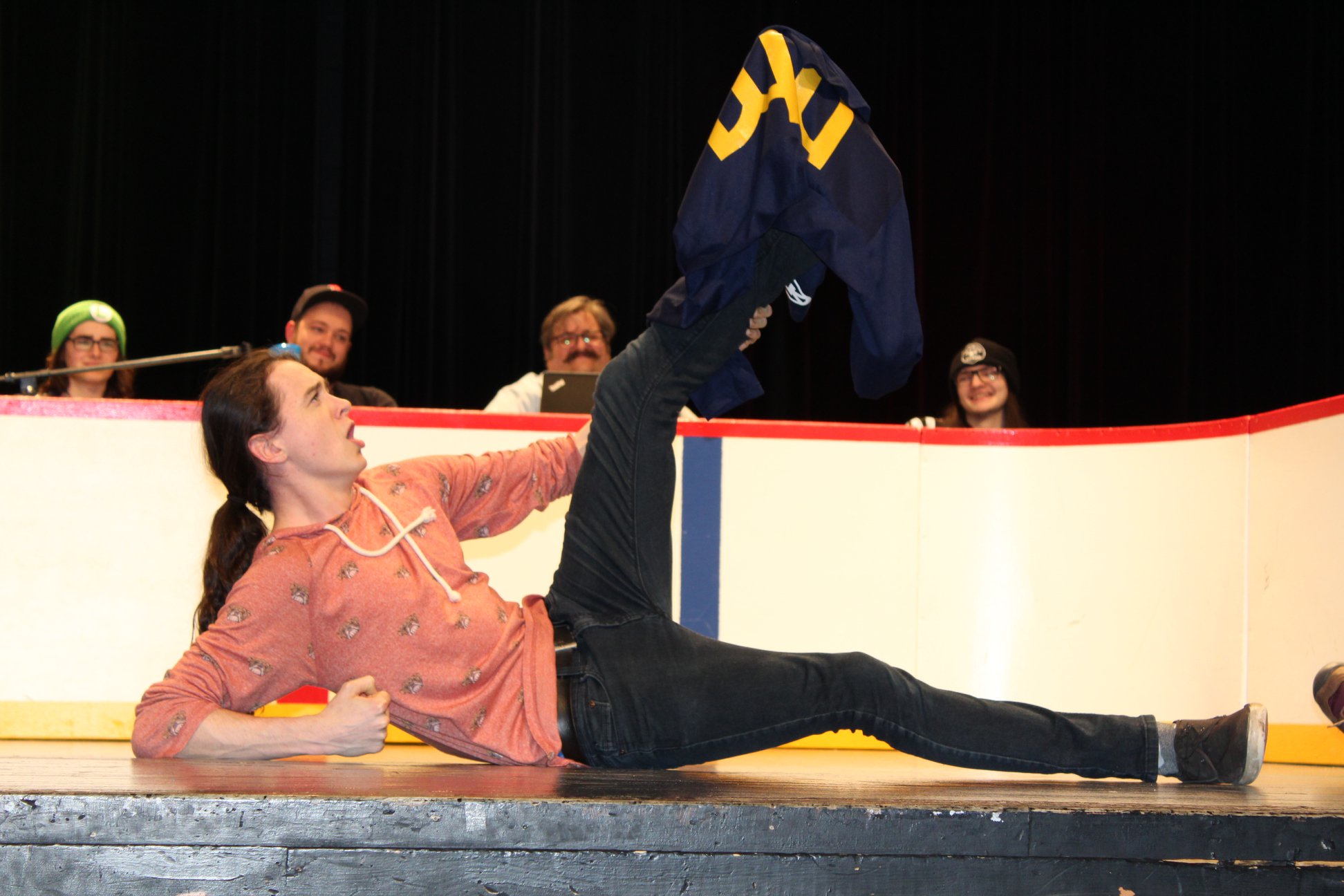 Quant au chandail de joueur, il est vrai que ça demeure un outil qui permet de donner des indices visuels au public pour qu’il comprenne mieux un aspect d’un personnage ou d’un élément de la situation, sans explications supplémentaires (par exemple, un chandail autour de la taille pour montrer que le personnage porte un tablier en cuisinant). Cependant, je crois qu’un bon mime peut souvent présenter adéquatement les mêmes informations pour assurer que les spectateurs identifient ce qui se passe. Ce qui m’intéresse plutôt est l’idée de rendre le chandail de joueur l’un des focus de l’impro. Lorsqu’on joue une catégorie avec accessoire, l’objet doit être au centre de l’impro, alors pourquoi ne pas faire la même chose en libre. En appliquant les connaissances de l’art de la marionnette, il est possible de manipuler un chandail pour lui donner une personnalité, ou pour traduire au public un ou des changements qui surviennent, contribuant activement au déroulement de l’histoire ou au ton de la situation. Que ce soit un drapeau qui change de direction dans le vent, un fantôme qui hante une maison, ou un monstre sous son lit, le chandail est malléable et mobile, offrant une multitude d’opportunités artistiques.
