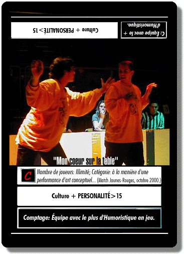 Concept : Chaque Impro dans le jeu rend immortelle une impro qui a été véritablement jouée à la Licum, la CUI, la LIA, etc. Ce sont de vrais thèmes avec une photo de cette même impro, et le texte nous dit même QUAND elle a été jouée et par quelles équipes (ici, un match Jaunes-Rouges en octobre 2000). Dans la mise en page, le texte en aussi renversé pour que chaque joueur puisse la lire. « Mon cœur sur la table » est une à la manière d’une performance d’art conceptuel, donc il semble très normal que la Culture soit impliquée. Mais vu que ce n’est pas un style facile pour le public, c’est aussi important de rendre ça drôle, percutant, WATCHABLE quoi. Et ça c’est la fonction de la PERSONALITÉ (c.-à-d. le charisme des Joueurs). Et s’il y a Comptage, on connaît nos publics, ils voteront pour le drôle avant tout, et donc l’équipe la plus Humoristique). C’est la grande leçon cachée sur cette carte : C’est bien de se mettre au défi avec des impros plus complexes et cultivées, mais en fin de compte, il faut rester divertissant.