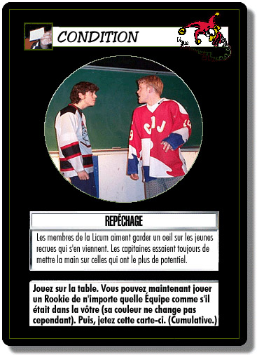 Concept : Un des problèmes qui vient avec des jeux de « cartes collectionables », c’est que le joueur n’a pas toujours accès à toutes les cartes possibles. Il se peut très bien que l’on n’ait pas, dans nos premiers tirages/achats, assez de cartes pour former l’équipe avec laquelle on veut jouer. Ou on a un bon mix d’Improvisateurs, disons Verts, à mettre sur notre banc, mais on aurait besoin d’un petit boost d’Humoristique que la carte de recrue de Christian Essiambre (Jaune) ou de Dominic Dalpé (Bleu) pourrait nous donner. Avec la carte de Repêchage, on peut aller combiner les couleurs, tant et aussi longtemps que le membre invité est une recrue (a la caractéristique Rookie). On jette ensuite la Condition, mais on peut avoir plusieurs Repêchages sur la table en même temps ou à la queue leu leu pour ajouter d’autres Improvisateurs. Un grand collectionneur pourrait y voir une utilité dans sa quête pour le parfait paquet de jeu, mais pour le débutant, la carte est pratiquement nécessaire pour assembler sa première équipe.