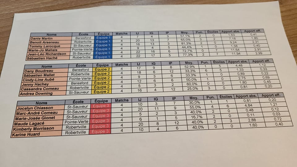 Notez bien la présence d’un certain Sébastien Haché dans l’équipe des Bleus. Non seulement il joue le plus souvent, mais il se tape le meilleur apport. À la conclusion de la journée, lui et Benoît Arseneau démontrent un intérêt de devenir membre de la L.i.C.. Ils deviendront les juges de ligne de la saison inaugurale. À noter aussi la présence de Sébastien Mallet, qui allait porter un jour les couleurs de l’E.S.N. ainsi que de la L.i.C.. Kimberly Morrison avait fait excellente impression, mais malheureusement, elle n’a pas développé un intérêt envers notre discipline.