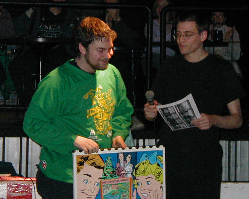 Notes sur l’image et le texte: Véritable détail d’une œuvre de Maître Phelps®, remis au Joueur le plus sympathique de la saison 2001-2002, Rémi Goupil.