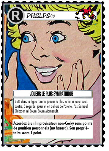 Dans le jeu : Comme dans la vie, gagner Le Plus Sympathique n’est pas le prix le plus prisé. C’est une marque d’amour que de le recevoir, mais les joueurs plus compétitifs aimeraient plutôt recevoir Plus Utile, etc. Donc, dans le jeu, Sympathique n’accorde pas beaucoup de points, mais est relativement facile à gagner. Si on compare à Plus Utile, qui requiert l’improvisateur dont le HAMSTER, la PERSONNALITÉ et le nombre d’impros jouées (moins le nombre de punitions – c’est un reflet de la formule de l’Apport) ont le total le plus élevé, eh bien, on est mieux d’être certain que l’on a les meilleures stats, sinon l’autre joueur pourrait nous voler les 3 points bonis, ce qui pourrait facilement leur gagner le match. Plus Sympathique est un risque (le choix est aléatoire), mais pas un aussi grand risque (1 point). Si on ne joue pas avec l’habileté Cocky, on met les chances davantage de son côté. On a moins de contrôle sur qui reçoit des Punitions, mais certaines autres cartes peuvent nous aider à garder ça sous contrôle. Une carte pour ceux qui veulent mettre les Phelps® à l’essai, mais qui sont inquiets par rapport à leur pouvoir dans le jeu.