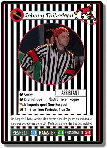 Une autre chose qui reste, c’est bien sûr les qualités. Un arbitre aussi fait preuve de Respect, de Hamster (vitesse) et de Personnalité. Dans le cas de Johnny, il y a des variables pour présenter un arbitre qui était apprécié des jeunes (malgré sa capacité de donner 20+ punitions par match), mais détesté des équipes universitaires en tournoi (pour la même raison). La solution ici était de faire Johnny s’améliorer avec le temps. En première période, on est choqué par sa sévérité (donc ses stats sont plus basses), puis en deuxième, on est habitué et on apprécie ça un peu plus (les stats montent de 1). Je ne peux pas vous dire pourquoi on a besoin de la variable quand l’habileté spéciale aurait pu être, tout simplement, Stats +1 en 2e période. Mais je m’amusais avec le concept de variables ici et sur d’autres cartes, donc c’est probablement issu d’une expérimentation.