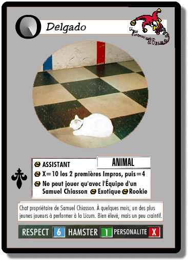 La carte, expliquée : Bien qu’un ANIMAL, Delgado était aussi ASSISTANT-Capitaine (le CAPITAINE était Vito, son frère). Tous les chats peuvent jouer n’importe quelle couleur de jersey, tant et aussi longtemps que leur humain est dans l’équipe. Dans ce cas-ci, c’est Samuel Chiasson qui a joué la majorité des couleurs. Ça adonne bien. Et tous les chats sont Exotiques, parce que c’est inusité de voir un animal de compagnie dans une arène d’impro. Delgado est aussi un Rookie, parce qu’il est juste un beubé! Pas même un an. Et oui c’était son premier match.