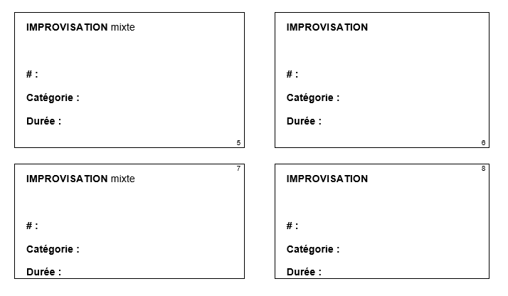 Il s’agit ici d’un match standard, soit de 2 périodes (les 4 impros d’en haut, numérotées 1-4, et les 4 impros d’en bas, soit 5 à 8). Le document numérique a bien des avantages :