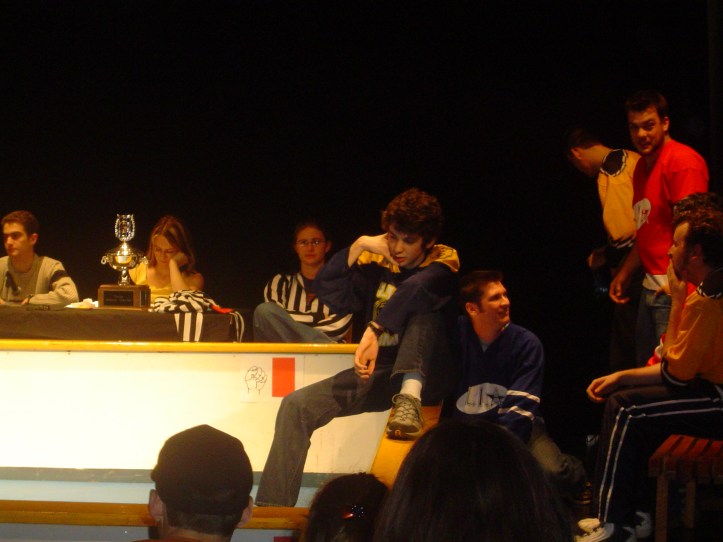 L’impro commence. J’ai aucune idée quoi faire. Le caucus n’a pas servi à grand-chose. « Ok George Michel, c’est à toi. » (Ok, j’arrête la blague sur mon nom; M. Hédou me l’a répété assez souvent: « En impro, une joke, tu la fait maximum 3 fois. ») La joueuse de l’autre équipe s’avance vers moi, me regarde… et j’agis avant de penser. Je mime un gars tellement excité de voir la fille de ses rêves qu’il se balance sur place.