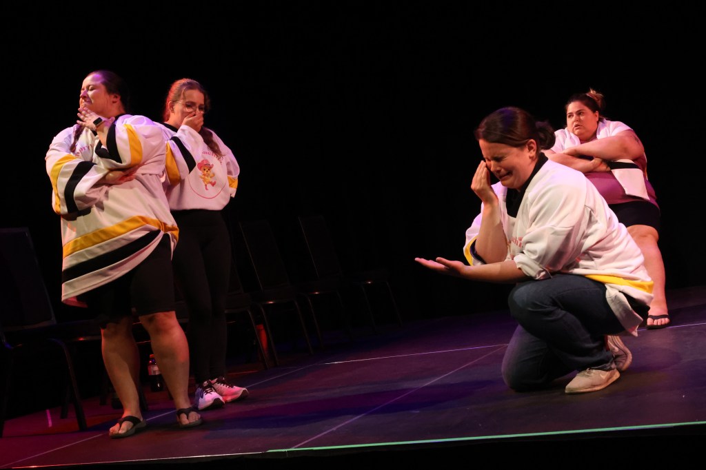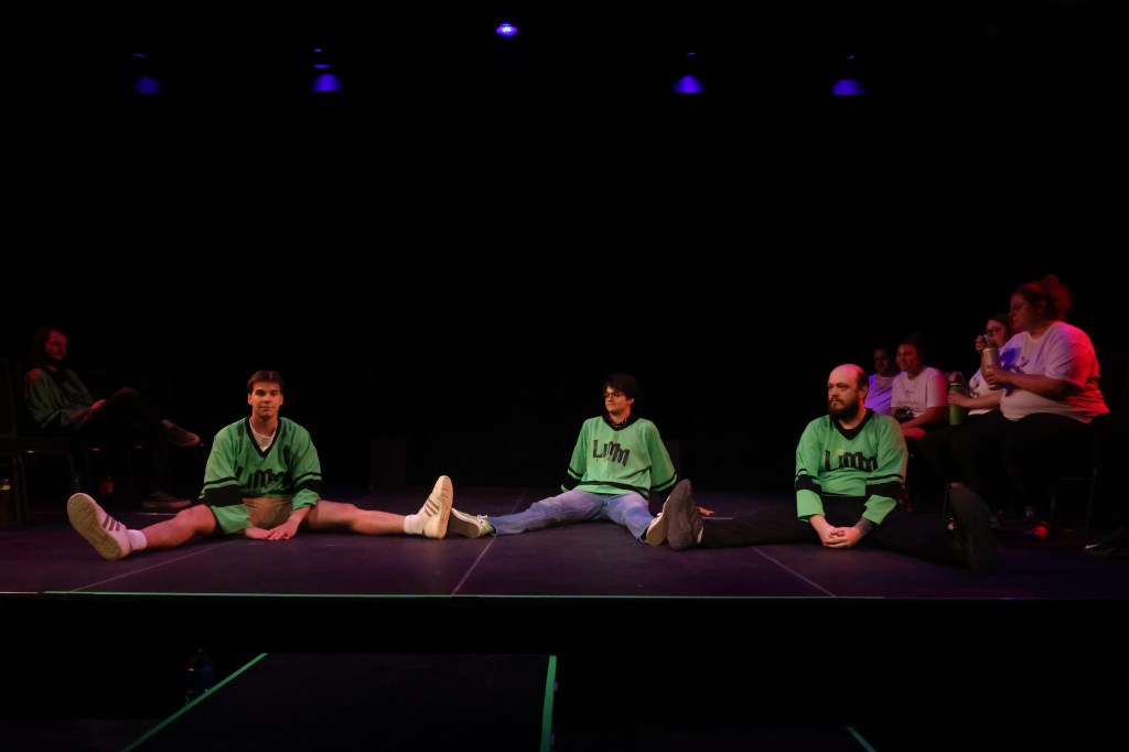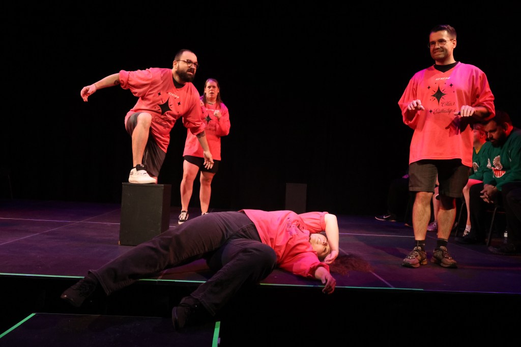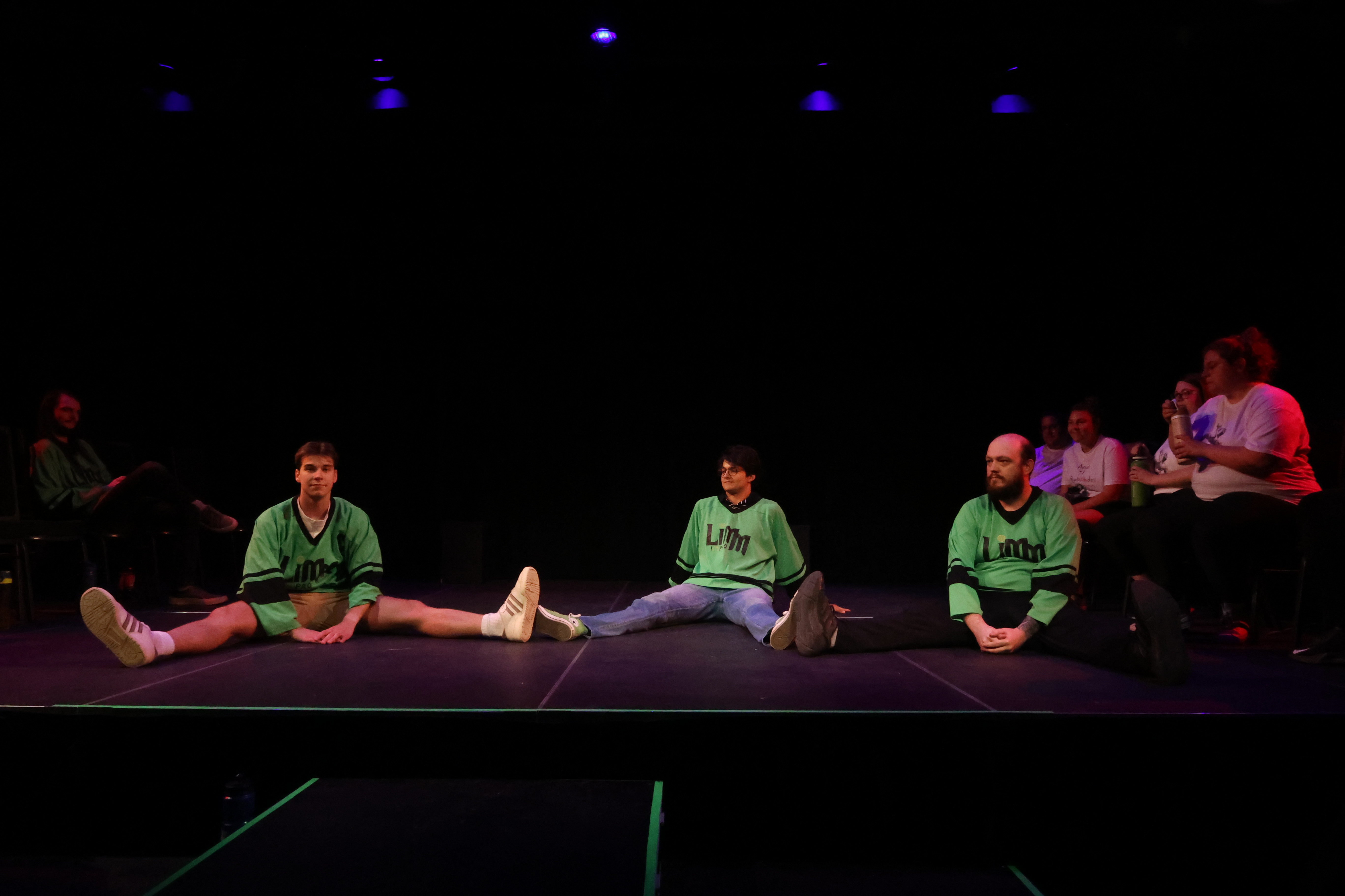 Ensuite, si l’on se souvient du thème, on peut l’utiliser comme point de départ pour interpréter les actions du joueur qui guide les autres. Le thème était « Ski de montagne » et le leadeur semble mettre un manteau. OK! On se prépare à sortir en hiver, probablement pour faire du ski. Si le thème était « Vert » et que la personne avec l’idée peint un mur, peut-être qu’on est en train de redécorer la salle avec de la peinture verte. Le nombre de joueurs que la personne invite dans l’impro peut parfois pointer dans une direction également. On prépare une différente impro si l’on est deux dans l’arène ou si l’équipe au complet est nécessaire. On devine, mais on devine basé sur des observations.